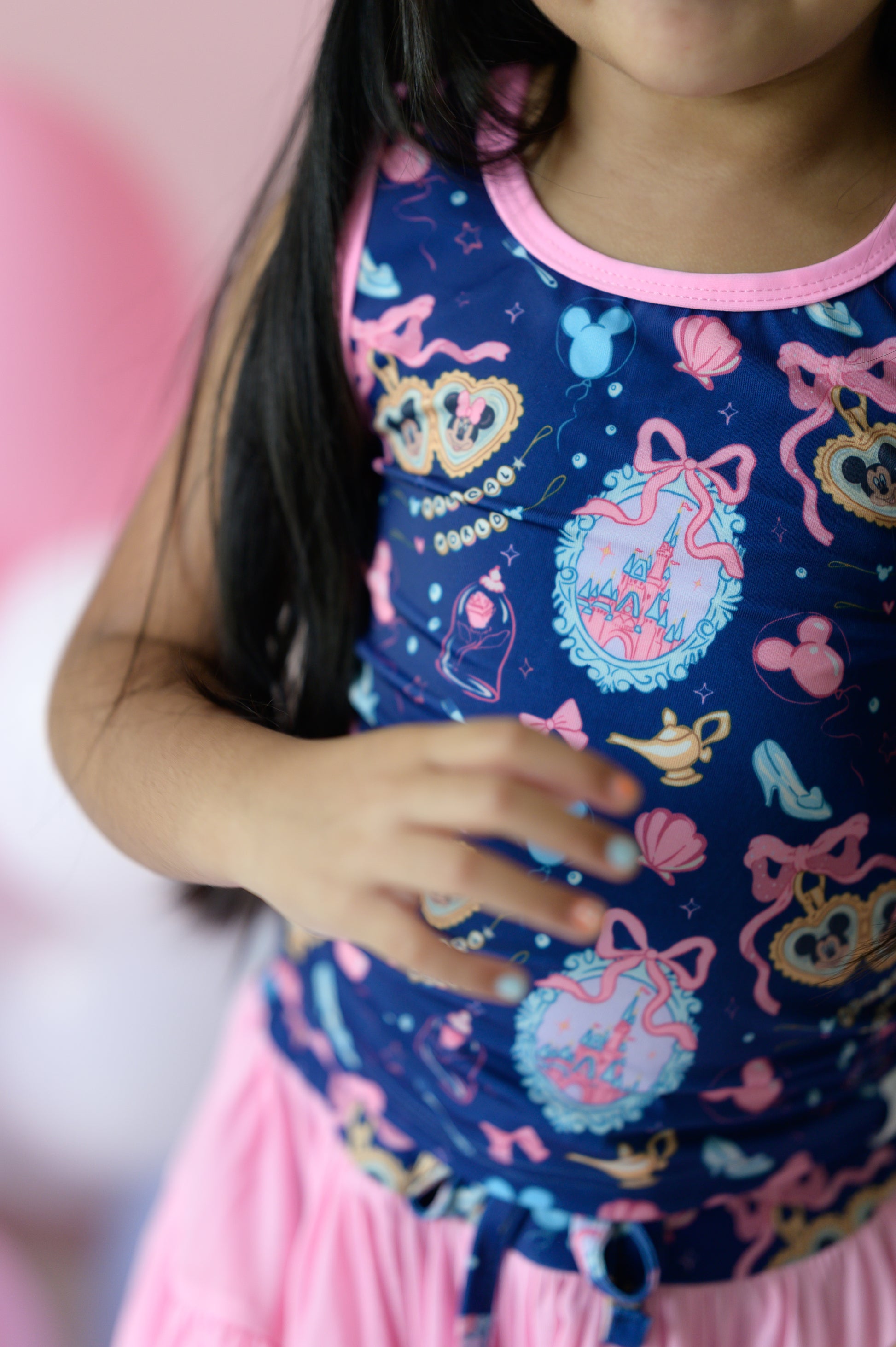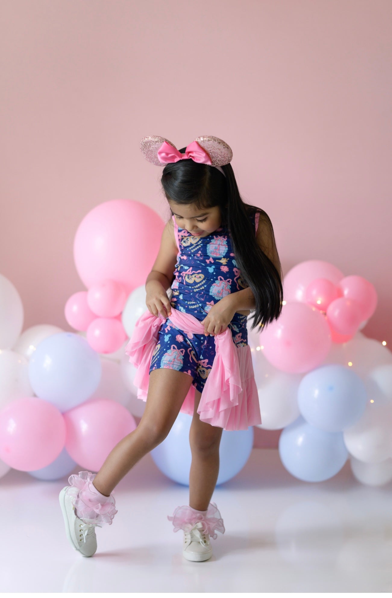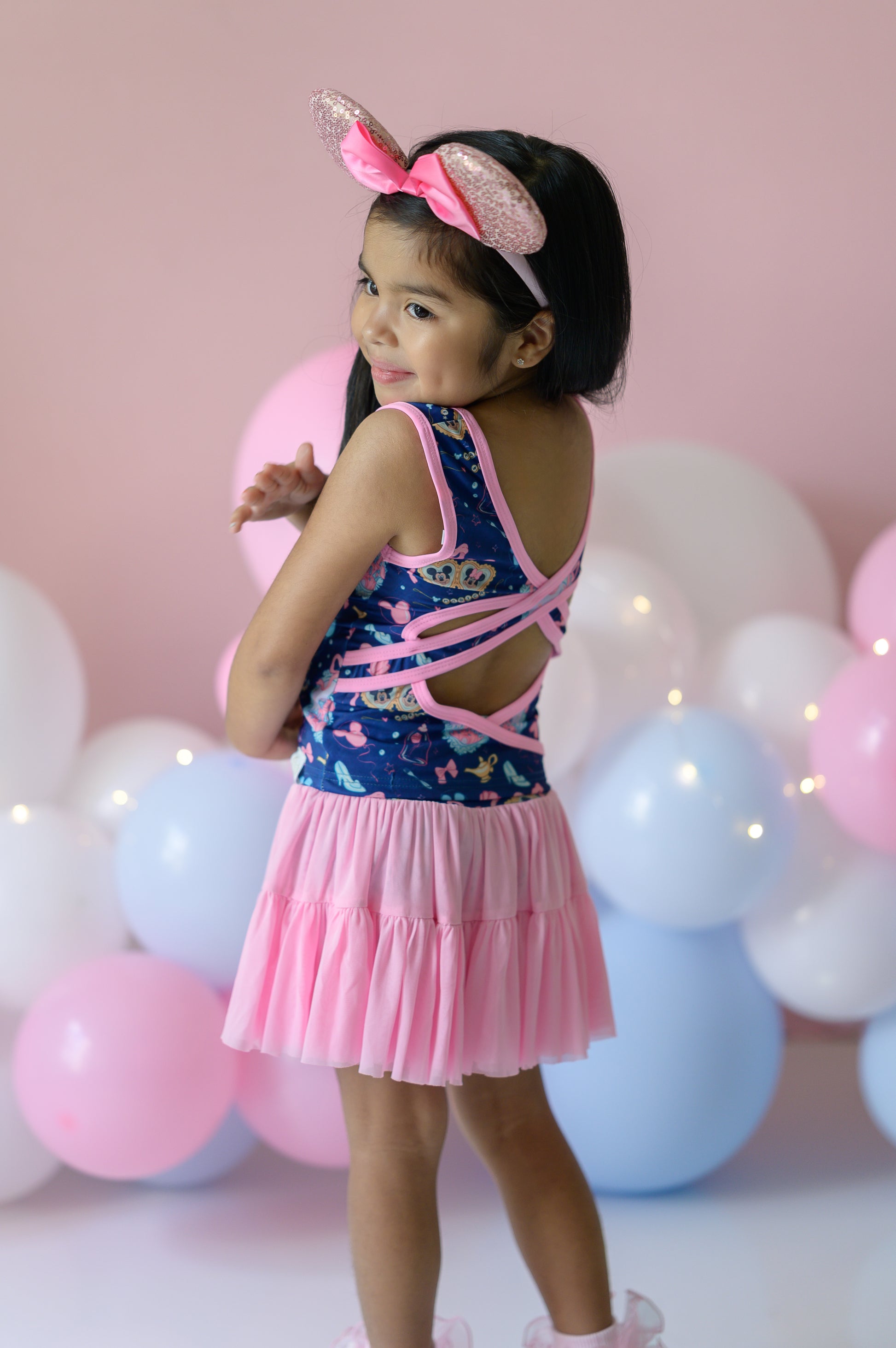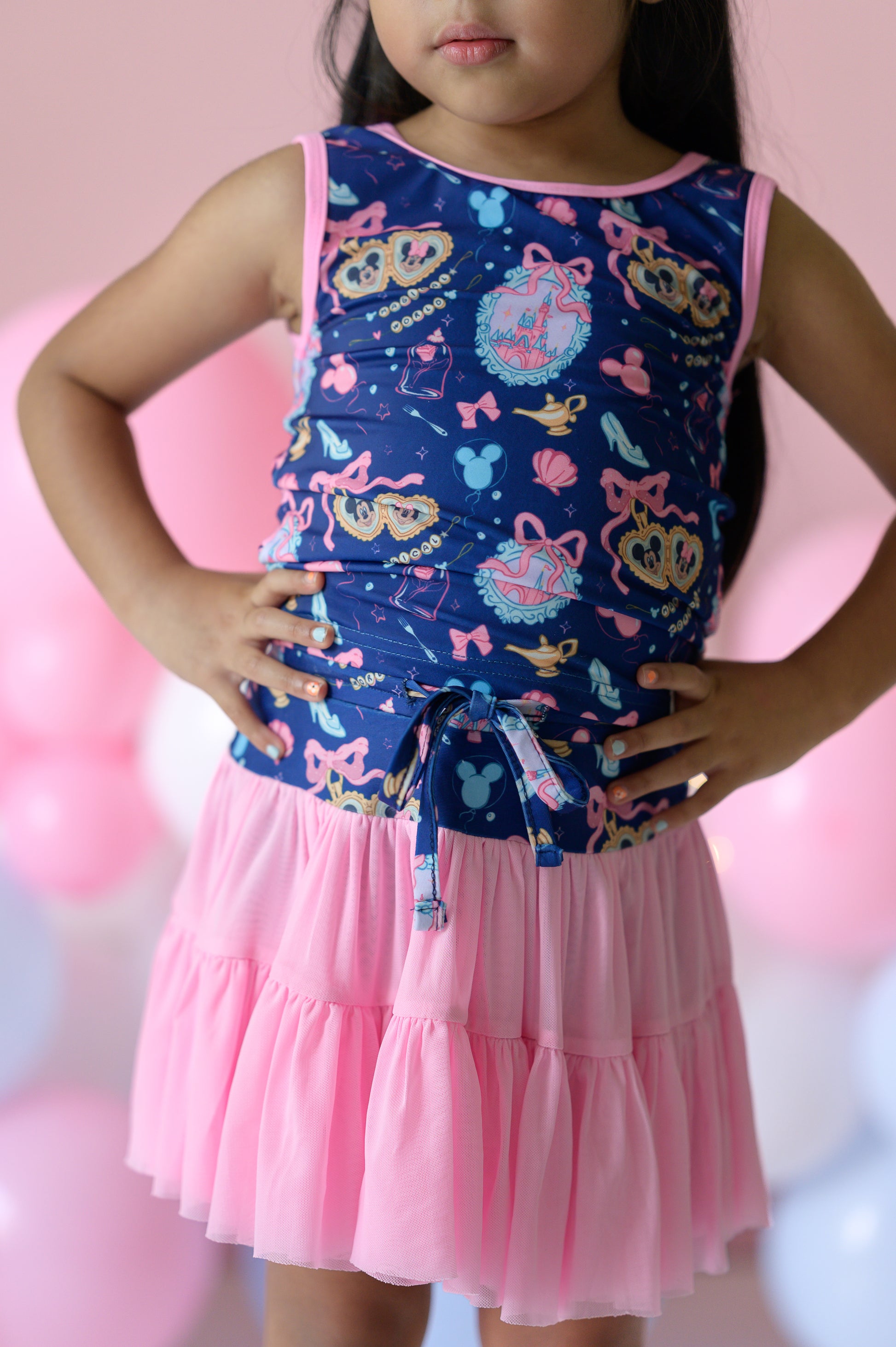 This Disney-inspired athletic set was made for little girls who love to move and sparkle. With a magical mix of castles, bows, teacups, and mouse ears on top and a flowy pink skirt that’s perfect for twirling, and everything in between